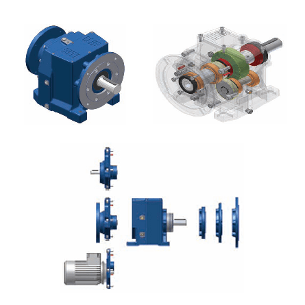 Комплектуется электродвигателями мощностью от 0,09 кВт до 90 кВт с крутящим моментом от 34 Нм до 13300 Нм и передаточным отношением от 5:1 до 470:1.